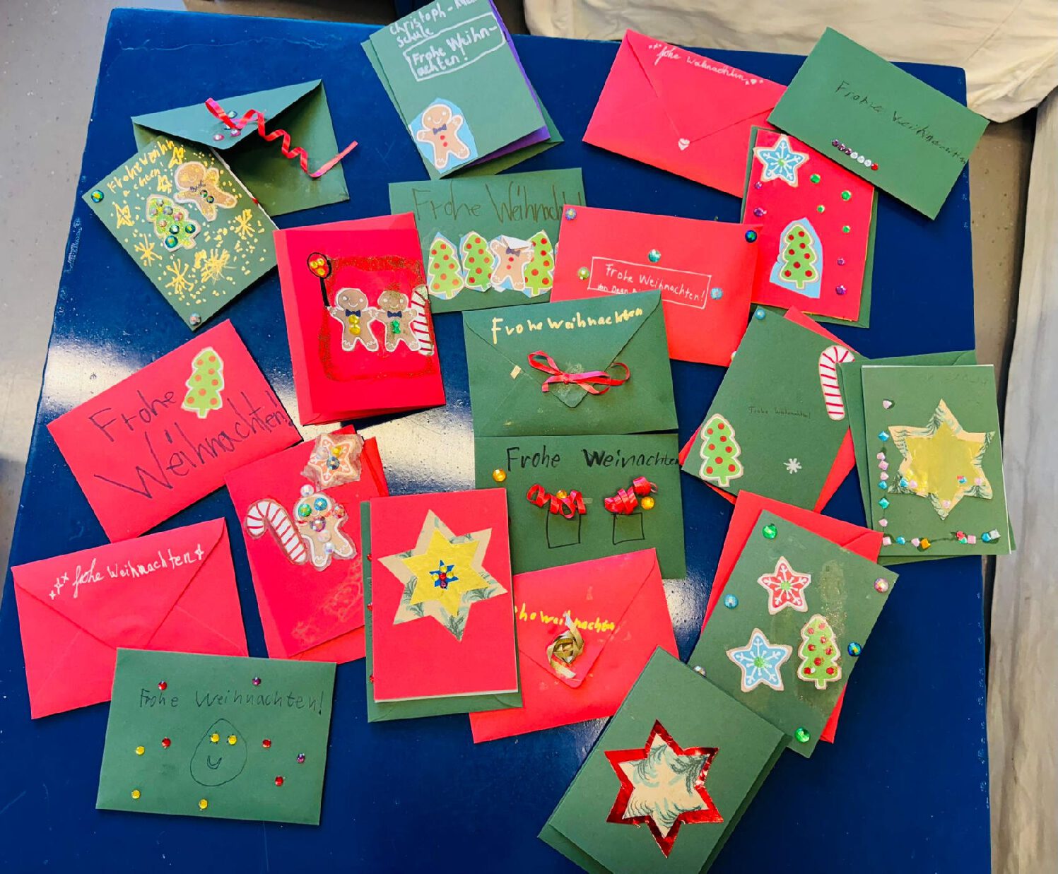 Im Gepäck hatten sie viele liebevoll gestaltete Weihnachtskarten, die die Kinder in dieser und der vergangenen Woche im Kunstunterricht gebastelt hatten.